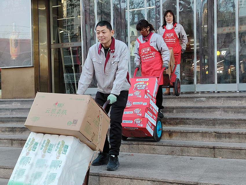 12月31日,民生店同事們齊心協力,利用開店前時間,裝配團購商品,確保團購業務及時配送。